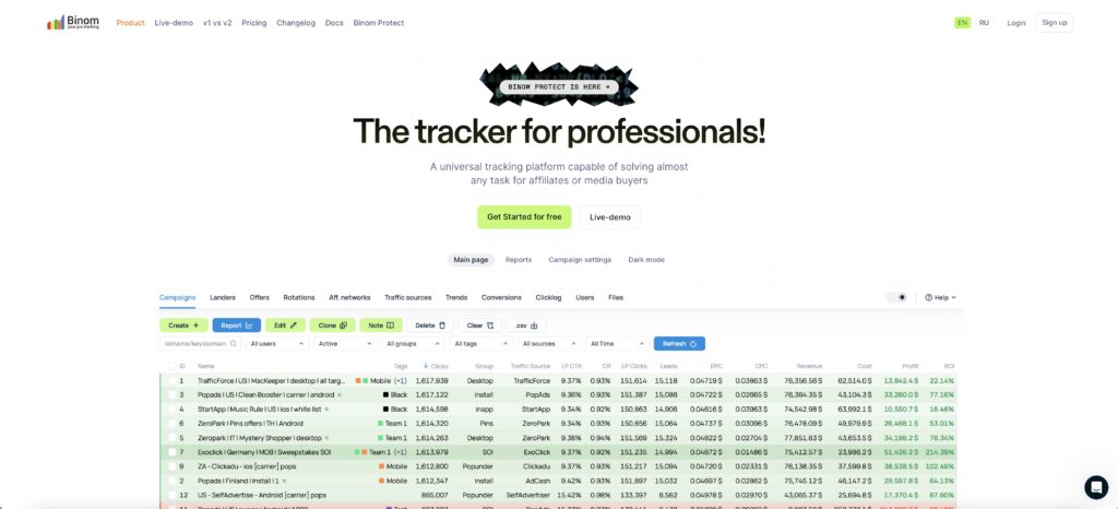Binom is a high-speed affiliate tracking software designed for performance-driven marketing for people who require both accuracy and speed. The platform does over 1 billion clicks every month and is really proud of tracking speed with 1 ms per click.